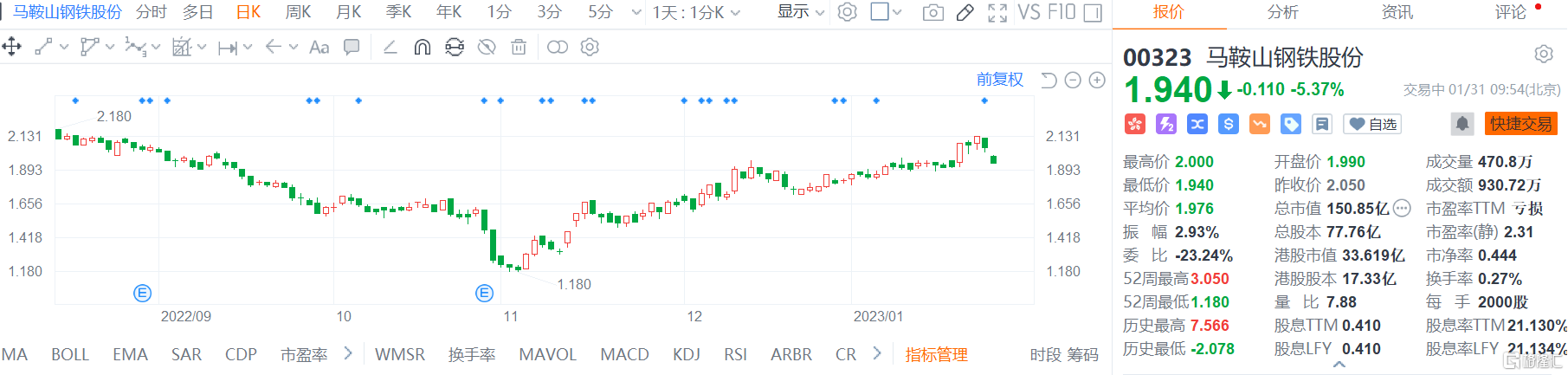 格隆汇1月31日丨马鞍山钢铁股份(0323.HK)低开低走,现报1.94港元,跌幅5.4%,总市值150.85亿港元。公司预计2022年度实现归属于上市公司股东的净利润为人民币-8.93亿元左右,同比下降116.75%左右。归属于上市公司股东的扣除非经常性损益的净利润为人民币-11.76亿元左右,同比下降121.73%左右。
