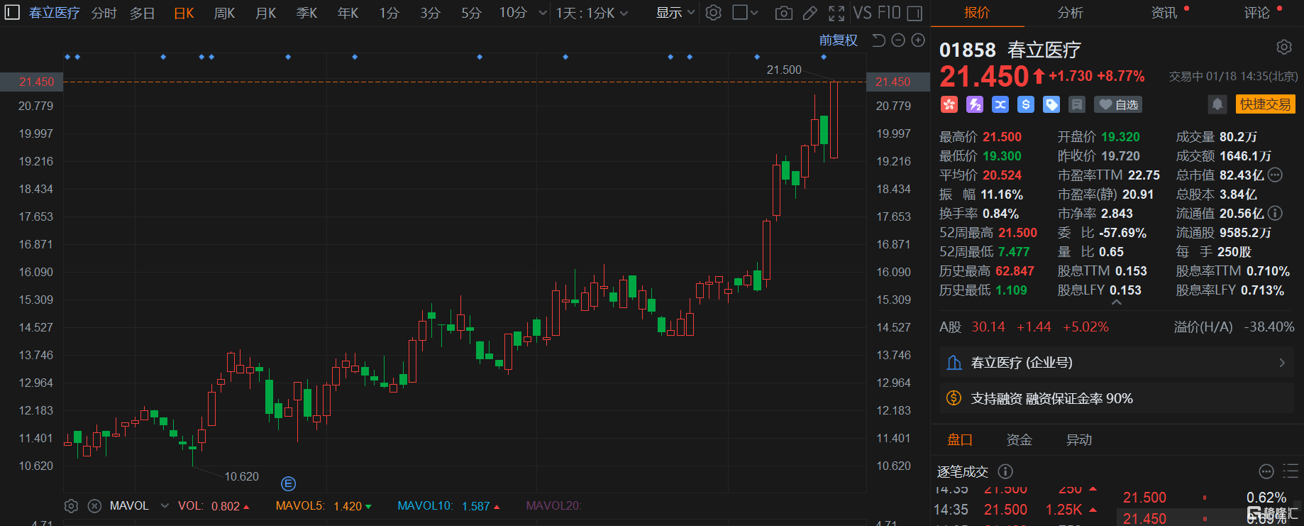 格隆汇1月18日丨春立医疗H股午后涨幅扩大至近9%,报21.45港元创14个月新高,A股涨5%,报30.14元。